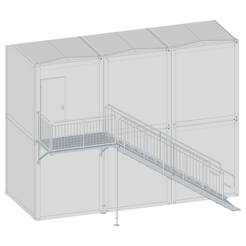 Aussentreppe aus Stahl mit langem Podest für die Montage an der Stirnseite von Containern oder Raummodulen.