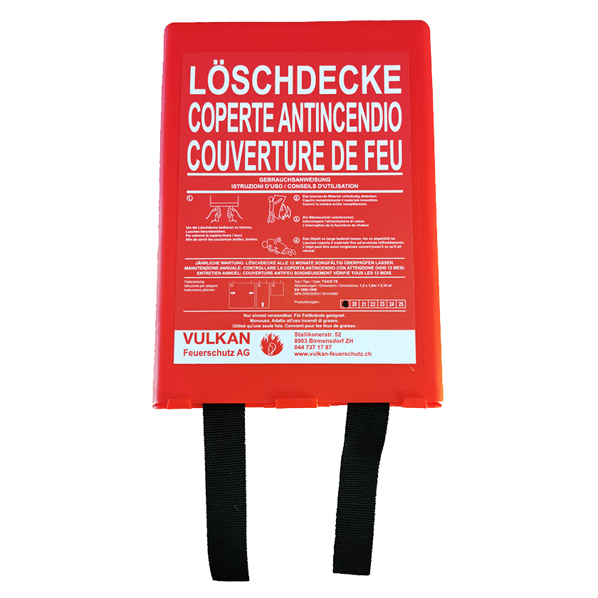 Aus Glasfaser, hitzebeständig, strapazierfähiges Gewebe, in PVC-Hardbox, mit schwarzen Griffbändern, Wandmontage.