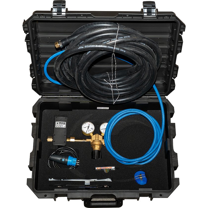 Das System nutzt Kohlendioxid (CO₂) zur Neutralisation von alkalischem Wasser. Das Gas durchläuft einen Gaswärmer und ein Druckreduzierventil, bevor es über den 10 m langen Begasungsschlauch feinblasig in das Abwasser eingeleitet wird. Dort reagiert das CO₂ mit dem Wasser zu Kohlensäure, wodurch der pH-Wert zuverlässig gesenkt wird.