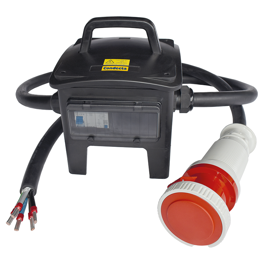 Die tragbare FI-Adapterbox mit CEE-Kupplung 125A schützt Baustromverteiler dank des integrierten allstromsensitiven Typ-B-Fehlerstromschutzschalters (RCD). Der vollgummierte Adapter ist UV-, säure- und laugenbeständig und für den harten Einsatz auf Baustellen konzipiert.