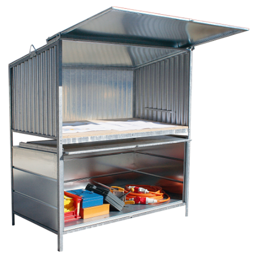 L'abri de jardin de type Kombi est entièrement galvanisé à chaud et dispose d'un couvercle verrouillable ainsi que d'un compartiment à outils pratique. La construction massive en profilés d'acier "Made in Switzerland" garantit une longue durée de vie. La paroi arrière translucide assure une surface de travail lumineuse.
