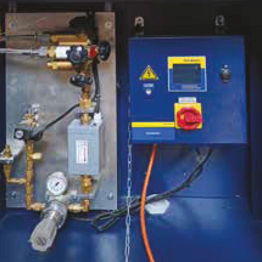 Der GSA Steuerschrank besteht aus einem Bauverteilerkasten, in dem die Steuerung und die Gasversorgung untergebracht sind. Am GSA-Steuerschrank können zwei Einzelflaschen befestigt werden. Die Gasreserve-Umschaltung erfolgt von Hand. Die pH-Messung dosiert automatisch die notwendige CO2-Menge zum Erreichen des korrekten pH-Wertes im Auslauf der Anlage. Eine Blinkleuchte am Steuerschrank signalisiert einen zu hohen pH-Wert.