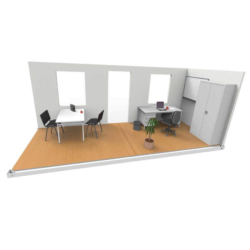 Das Office-Paket «ECONOMY» besteht aus einem Bürotisch mit integrierten Schubladenstöcken, einem Bürostuhl, einem Besprechungstisch mit zwei Konferenzstühlen, einem Kleider- und Aktenschrank, einem Whiteboard, einem Papierkorb und einer Kaffeemaschine.