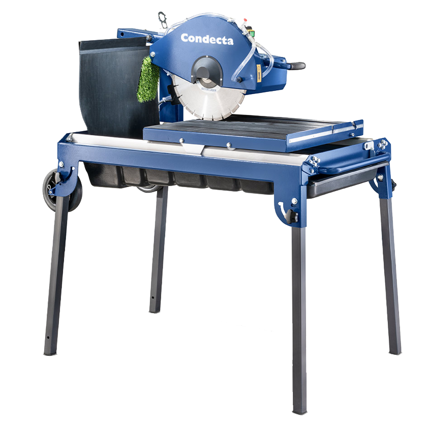 - Geschweisste Stahlkonstruktion und Kunststoffwasserwanne mit exakter Tischauflage für passgenaue Schnitte